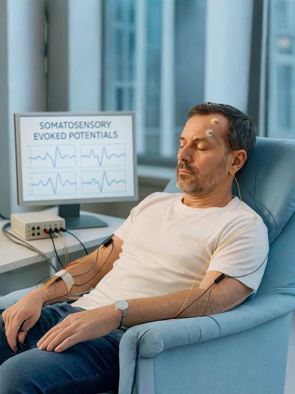 I potenziali evocati somatosensoriali sono un esame neurofisiologico che consente di valutare l’integrità funzionale delle vie sensitive, analizzando la trasmissione dello stimolo nervoso dalla periferia al midollo spinale fino alla corteccia cerebrale. L’esame si svolge mediante l’applicazione di lievi stimolazioni elettriche su specifici nervi degli arti, con registrazione della risposta attraverso elettrodi posizionati sulla cute lungo il decorso del sistema nervoso; si tratta di una procedura non invasiva, generalmente ben tollerata, che può causare soltanto un modesto e momentaneo fastidio legato alla stimolazione.